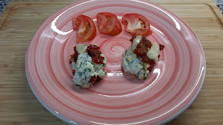 Hacemos unas bolitas con la mezcla de la ricotta, las ponemos en una bandeja de horno y ponemos un poco de sofrito por encima.